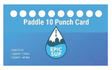 Our paddle 10 punch card is good for 10 1-hour or 5-day paddles any day of the week during open hours. Purchasable at the dock.
